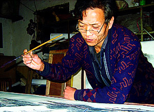 新闻助读:李光艺,昌乐县鄌郚镇东水码头村农民,虽眇一目跛一足,却穷三十年精力,创造出以环保漆等为颜料、以特制画布为载体、融合中国国画技法以及西方油画技巧的一门独特艺术--中国油漆画。在2008奥运会即将来临之际,他准备创作大幅画卷,向奥运献礼。